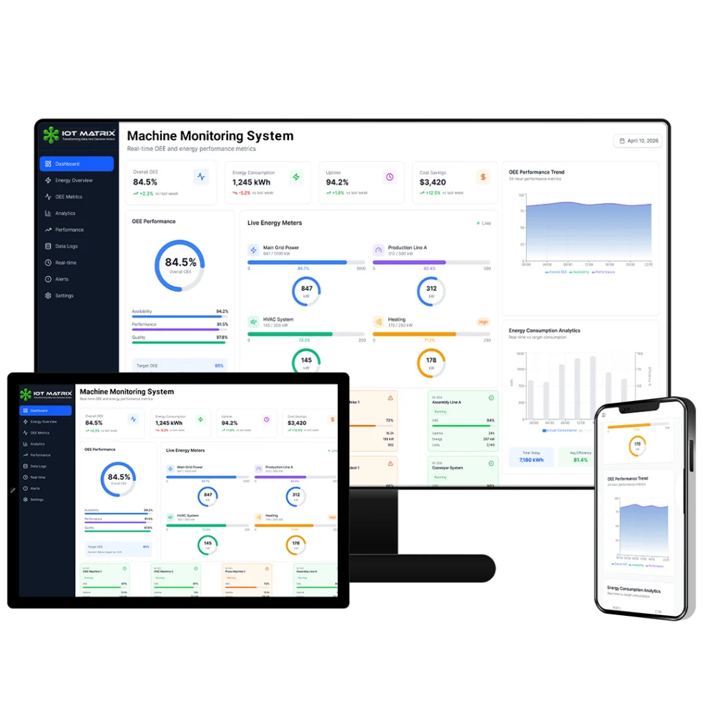 MachineMatrix is a centralized platform designed to help businesses monitor machine operations, track production activity, and manage shop floor performance from one dashboard. It provides access to live machine status, downtime records, production reports, performance analytics, and alert notifications, making it easier for teams to track operations, identify issues, and maintain smooth production flow across the facility.